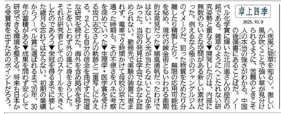 ▼生理学・医学賞を受ける坂口志文(しもん)さんの軌跡と二重写しにみえる。2人とも自分の信念を曲げずに地道な研究を続けた。海外を含め拠点を移すことをいとわず外の風に身をさらした。それが研究者としてのスケールを大きくしたのであろう。