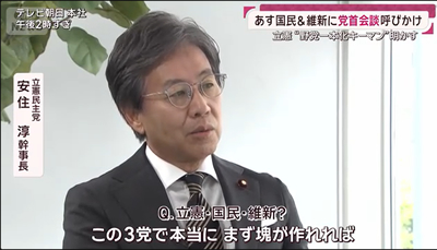 (立憲民主党安住淳幹事長)「週明けに、正式に、初めて申し上げますけど、日本維新の会と国民民主党に、党首会談を呼びかけたいと思います。首班指名に向けて、基本政策を含めて、しっかりとした話し合いをさせていただくということで、これはもう党首会談をぜひ呼びかけるので、ご参加願って、ご懸念があれば言っていただければと思っています」