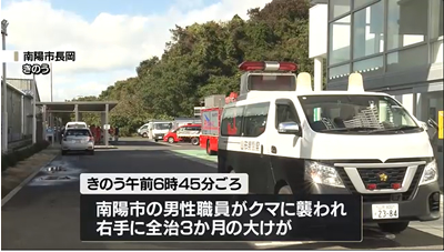 1日午前6時45分ごろ、南陽市長岡でクマのパトロールをしていた市職員の58歳の男性がやぶの中から飛び出してきたクマ1頭に右手を引っかかれ、全治3か月の大けがをしました。事態を受け市は1日、現場付近の3か所に箱わなを設置しましたが、現在も捕獲には至っていません。クマの行方はわかっておらず市と警察が引き続きパトロールを行い警戒に当たっています。