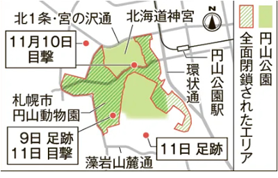 札幌市は11日、同市中央区の円山公園内や周辺の住宅街で相次ぐヒグマの出没を受け、同公園を全面閉鎖した。全面閉鎖は1909年(明治42年)の開園以来、初めて。公園内や周辺で確認されたクマの足跡は大きさが一致しており、同一個体の可能性がある。クマの行動が活発化する冬眠前の時期にエサ不足に陥り、人の生活圏に出没しているとみられ、専門家らは冬眠が始まる12月に入るまで全道的に出没が続くと懸念する。