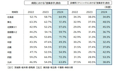 地域別にみると(病院本部の所在地)、2024年度の病院経営で最も営業赤字の割合が高いのは「四国」(72.3%)で、全体の7割を占めた。次いで「北陸」(71.7%)、「北海道」(64.9%)、「九州」(63.8%)と続いた。最も低いのは「中部」(49.3%)で、5割を下回る水準だった。