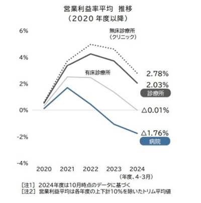「営業利益率平均」をみると、2024年度における「病院」の平均は△1.76%と、大幅な赤字水準となった。前年度(△1.07%)に続き、2年連続で赤字水準での推移となったほか、単年度としては過去20年で最低となった。「診療所」平均(2.03%)に比べて3.79pt差、診療所のうち入院設備をもたない「無床診療所(クリニック)」の2.78%とは4.54pt差と、いわゆる「開業医」との間で収益力の差が広がった。