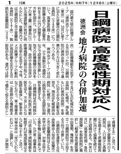 日鋼病院を運営する社会医療法人母恋(室蘭市)と市立室蘭病院はともに赤字が続き、対等合併する案を軸に協議が進んでいた。ただ東上理事長は「行政主導で病院機能を制限すれば地域医療はさらに縮小する」と述べ、対等合併は「受け入れられない」と強調した。(尹順平)