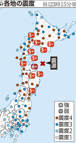 北海道と東北の太平洋側などでは一時、津波警報や注意報が発表され、岩手県久慈市で70センチの津波を観測したが、9日朝までに全て解除された。震源地付近では9日午後8時までに震度1~4を観測する地震が計17回起き、地震活動が活発な状況が続いているとみられる。