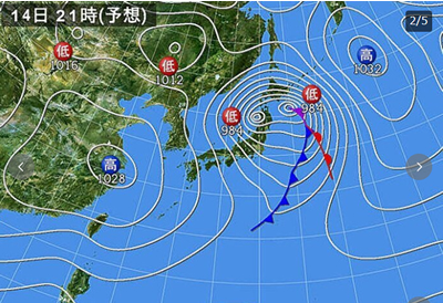 今日14日は、四国の南の低気圧が急速に発達しながら本州の太平洋側を通って北海道付近に進み、日本海西部の低気圧も急速に発達しながら東北へ進むでしょう。