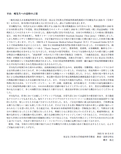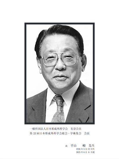 一般社団法人日本形成外科学会名誉会員・東京女子医科大学形成外科初代教授の平山峻先生は2025年(令和7年)6月8日,99年間の生涯を終え天に召されました。謹んで哀悼の意を表します。