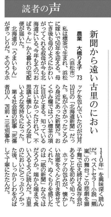 私は標茶で生まれ、浜松に嫁いで50年を迎える。母亡き後も母のようにかわいがってくれる叔母が今も北海道にいる。今年もその「おばちゃん」から暮れの宅配便が届いた。