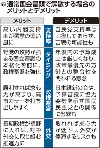 首相は昨年12月、側近に今年前半までの解散日程案を作るよう指示した。最速は昨年末の臨時国会会期末だったが、予算編成作業への影響を避けるため見送り、次の選択肢だった「通常国会冒頭」に照準を合わせるようになった。