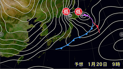 低気圧が日本の東にあって、急速に発達しながら東北東へ進んでいる。また、別の低気圧が日本海北部をゆっくり南下しており、20日午後は北海道に進む見込みだ。日本付近は20日は冬型の気圧配置が次第に強まり、21日から25日頃にかけて強い冬型の気圧配置が続く見込み。