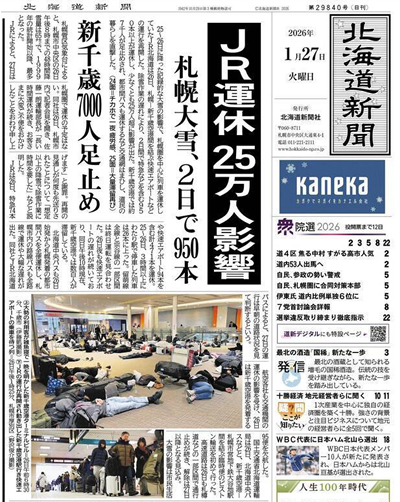 26日まで2日間にわたった記録的な大雪の影響で、JR北海道は27日、車両や乗務員の人繰りのため、特急など144本を運休する。札幌と旭川などを結ぶ特急23本のほか、26日に運航を再開した札幌-新千歳空港間を結ぶ快速エアポート24本などを運休する。宗谷線の南稚内-稚内間は午後5時ごろまで運転を見合わせる。