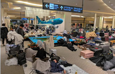 空港ビルでは滞留者の続出に備え、毛布6千枚、寝袋4千枚を保管している。ただ、今回の滞留者は想定の3500人の2倍となる約7千人に上り、HAPは「全員に行き渡らない可能性が高く、配布しても行列ができて新たな混乱を招きかねない」と判断した。