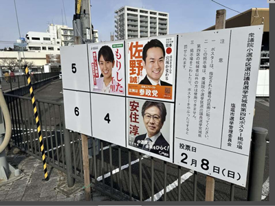 宮城4区には、参政新人の私立学校職員、佐野誠氏(41)、中道前職の党共同幹事長、安住淳氏(64)、自民前職の環境政務官、森下千里氏(44)が立候補している。