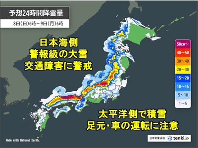 今日8日(日)が大雪のピークです。日本海側では警報級の大雪となっており、普段雪の少ない関東など太平洋側でも積雪となっています。このあとも日本海側では雪が強く、平地でもさらに積雪が増えるでしょう。車の立ち往生など交通障害に警戒が必要です。太平洋側でも積雪が増える所があるでしょう。今日8日(日)は衆議院議員総選挙の投開票日ですが、積雪や路面の凍結に注意が必要です。