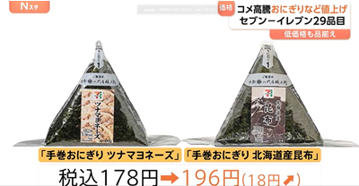 値上げ幅は平均で20円ほどで、「手巻おにぎり ツナマヨネーズ」と「手巻おにぎり 北海道産昆布」は、178円から18円引き上げで196円に。