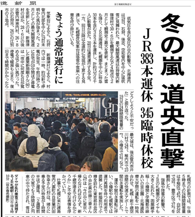 このほか、北海道中央バスやJR北海道バスは札幌市内の路線バスで始発から一部区間を運休。高速道路は吹雪のため、通行止めが相次いだ。