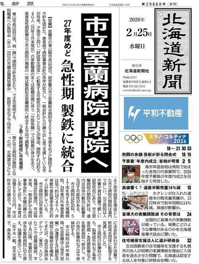 今回、市は閉院に大きく舵を切ったが、思惑通りに進むか見通せない。一部機能は製鉄病院に集約する方針だが、詳細なスケジュールなどは未定。室蘭市では異例の公立病院の閉院で、地域住民に不安が広がる可能性もある。青山市長には丁寧な対応と説明が求められる。(佐々木一範)