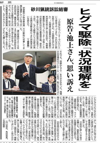 25年度の砂川市のクマ出没件数は前年度比4倍の221件と激増し、道は「ヒグマ注意報」を発令。それでも記録が残る1962年度以降、砂川でのクマによる人身事故ゼロは続いており、猟友会員に対する地元住民と行政からの信頼は厚い。池上さんは「本年度はヒグマに2人も殺された。ツキノワグマはもっと人を襲う。クマの数が増え、狭い日本に密集している状況を(裁判官も)理解してほしい」と呼びかけた。(内山岳志 、角田悠馬 、石垣総静)