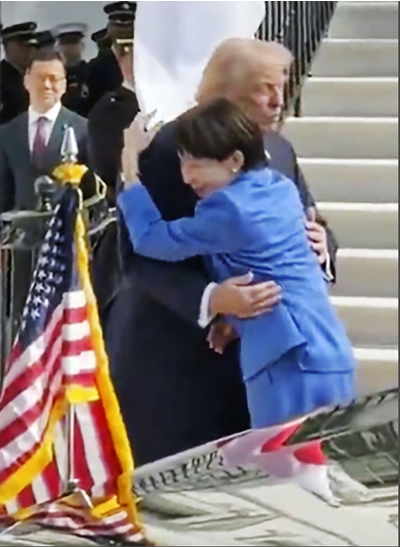 首脳会談を前に、トランプ米大統領とハグを交わす高市首相(手前)=19日、ワシントン(ホワイトハウスのXから)(KYODONEWS)