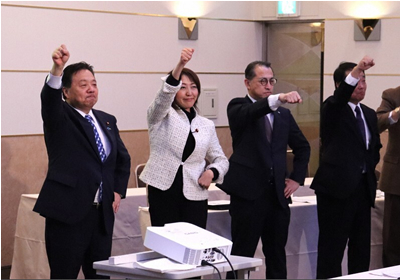 立憲民主党道連の合同選挙対策本部の発足会に初めて参加し、立憲の衆院議員らと「ガンバロー」と声を張り上げる公明党道本部の佐藤英道代表(左端)=札幌市中央区で2026年1月20日午後6時53分、後藤佳怜撮影(毎日新聞)